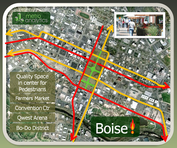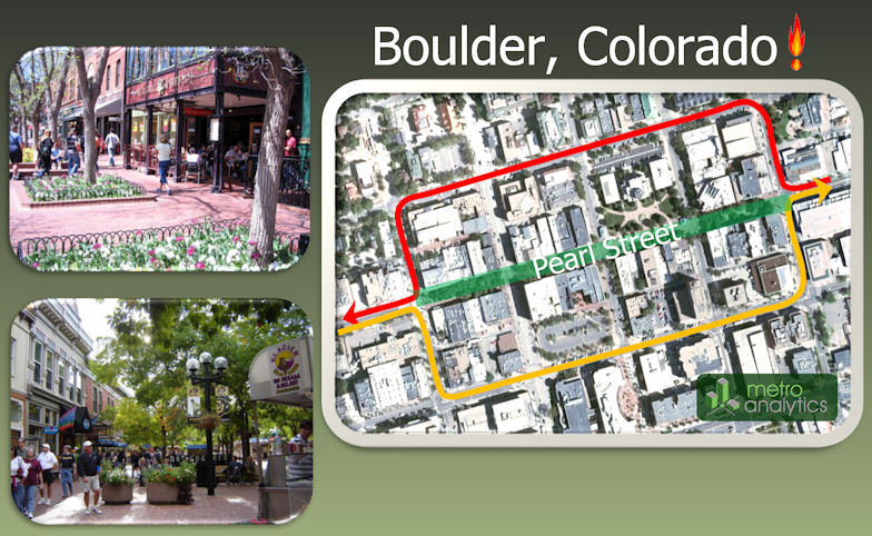 Boulder's Pearl Street area can support high densities largly due to this "Triplet" configuration.
