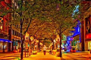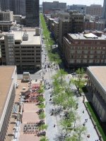 It has a 22-foot pedestrian zone in the middle and 10-foot shuttle paths on either side. The sidewalks are generally 19 feet on both sides. Double rows of honey locust trees and specially designed post lanterns in the pedestrian median provide shade and appropriate lighting while allowing for visibility of the buildings (and business tenants) running the length of the street.